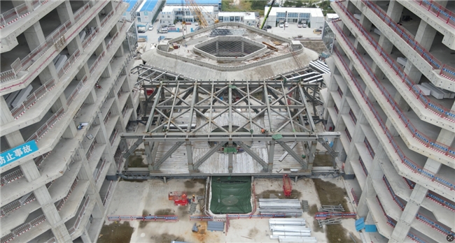 突破常規,技術創新引領千噸連廊平地起。為降低施工風險、提高施工效率,項目根據國內外類似工程建造經驗,查閱大量國內外相關專業資料,逐一攻克了鋼結構轉換胎架拼裝平臺免回頂技術、鋼結構桁架預起拱技術、鋼連廊結構自提升技術、鋼連廊液壓整體提升技術,為鋼結構連廊施工全過程提供技術保障。