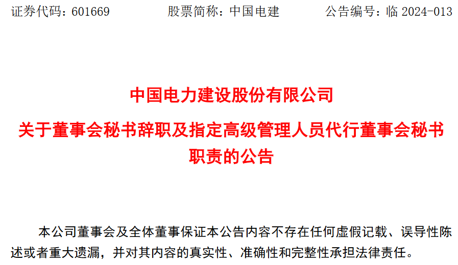 中國電建發(fā)布公告稱,中國電力建設(shè)股份有限公司(以下簡稱“公司”)董事會(huì)秘書丁永泉先生因年齡原因(退休)已向公司董事會(huì)遞交書面辭職報(bào)告,申請辭去公司董事會(huì)秘書職務(wù)。
