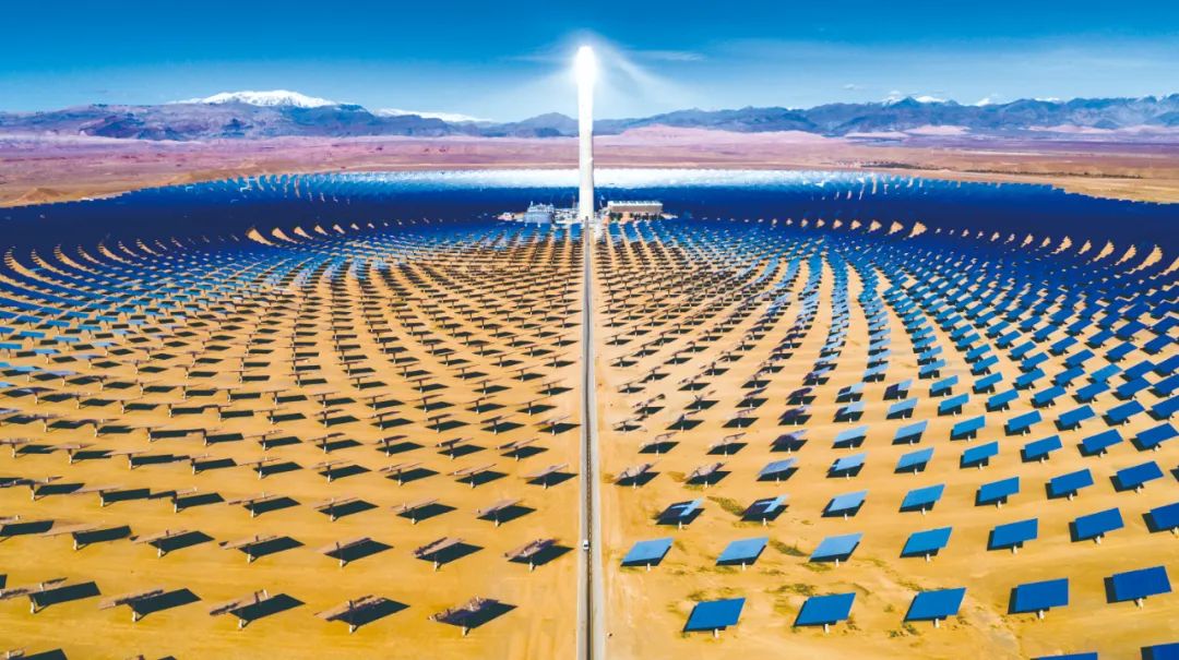 中國(guó)電建建設(shè)完成的全球裝機(jī)容量最大的塔式太陽(yáng)能聚熱電站——摩洛哥努奧Ⅲ期150兆瓦光熱電站。