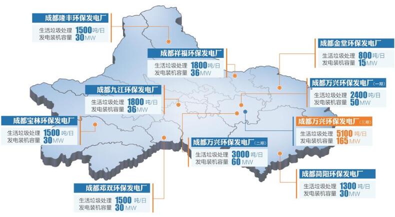 目前,成都已有的9座垃圾焚燒環保發電廠:九江、祥福、萬興一期、隆豐、金堂、萬興二期、寶林、簡陽、鄧雙環保發電廠,日均總發電量約為700萬度。待2025年萬興三期建成投產后,屆時成都10座環保發電廠日均總發電量預計將達到1100萬度。