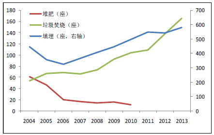 我國(guó)三種方式垃圾處理廠增長(zhǎng)情況(座)