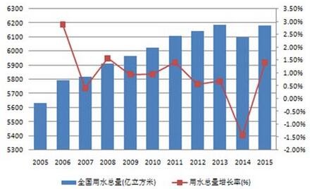 過去10年間,隨著人口增長,城市建設(shè)以及經(jīng)濟(jì)增長,全國用水總量總體呈現(xiàn)持續(xù)增長態(tài)勢,在2015年達(dá)到6180億立方米。(其中,由于首次進(jìn)行最嚴(yán)格水資源管理制度考核、以及農(nóng)業(yè)水價(jià)綜合改革和工業(yè)用水差別水價(jià)政策的推進(jìn),2014年的農(nóng)業(yè)和工業(yè)用水量分別出現(xiàn)下降,全國用水總量同時(shí)環(huán)比下降1.4%。)05至15年的用水總量年均復(fù)合增長率約為0.93%,據(jù)此計(jì)算到2030年全國用水總量將達(dá)到7100億立方米。這一預(yù)測與《全國水資源綜合規(guī)劃》劃定的2030年用水上限不超過7000億立方米基本一致。因此,在可預(yù)見的未來,用水量仍將繼續(xù)增長。
