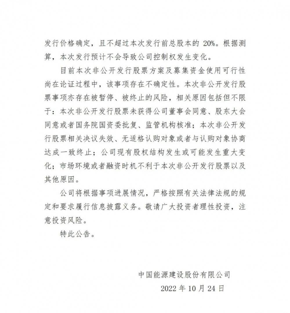 10月23日,中國能建公告稱,為助力公司“30·60”戰略目標落地,構筑新能源、新基建、新產業“三新”發展平臺,公司正在籌劃非公開發行A股股票事項,擬將募集資金用于以新能源為主的新型綜合能源項目,包括光伏、風電、氫能、儲能等新能源一體化、專業化項目,新能源工程施工項目、新能源重大裝備采購,以及生態環境治理、新型基礎設施等項目。據悉,本次募集資金總額在人民幣150億元以內。本次非公開發行股票方案最終以經公司董事會、股東大會批準及國務院國資委批復、本公司證券上市地的證券監管機構核準的方案為準。