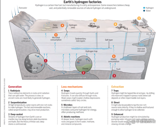 (圖片描述:氫是如何在地下形成的。來源:《科學》期刊的“隱藏的氫氣:地球上有大量可再生無碳燃料嗎?”)