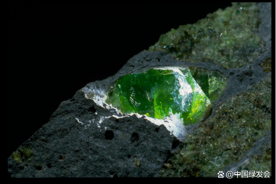 (鎂橄欖石,一種橄欖石礦物。地下水與橄欖石相互作用會導致氫氣在周圍巖層中積聚。圖片來源:史密森尼國家自然歷史博物館。)