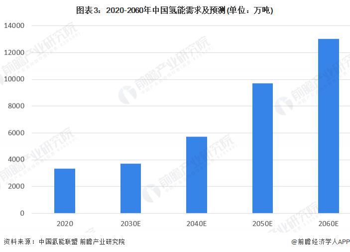 根據(jù)中國氫能聯(lián)盟的預(yù)測,2020 年以后中國氫能需求將持續(xù)增加,尤其是 2030 年以后,為達成 " 碳中和、碳達峰 " 的目標,氫能需求量將大增。到 2060 年,中國氫能年需求將超過 1.3 億噸。