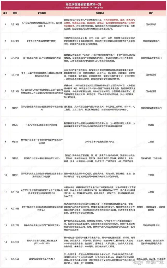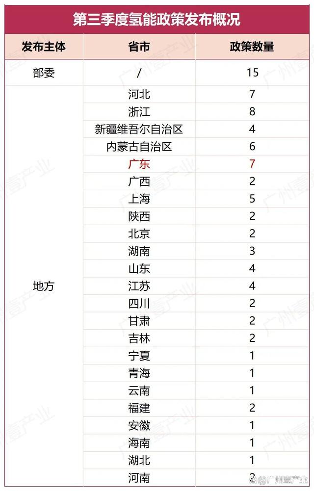 9月17日,浙江省嵊州市人民政府發(fā)布了《關(guān)于加快推進(jìn)新能源裝備產(chǎn)業(yè)高質(zhì)量發(fā)展的實(shí)施意見(jiàn)(征求意見(jiàn)稿)》。其中提到,積極布局發(fā)展氫能產(chǎn)業(yè)。布局發(fā)展氫能“制儲(chǔ)輸用”、氫燃料電池系統(tǒng)等氫能產(chǎn)業(yè)鏈。9月14日,山東省能源局發(fā)布了《關(guān)于開(kāi)展能源綠色低碳轉(zhuǎn)型試點(diǎn)示范建設(shè)工作的通知》。文件中涉及到氫能的內(nèi)容有:鼓勵(lì)發(fā)展風(fēng)電、光伏發(fā)電制氫,培育可再生能源開(kāi)發(fā)利用新模式新業(yè)態(tài);積極推進(jìn)核能海水淡化、核能制氫等研究示范等。9月13日,佛山市人民政府印發(fā)了《佛山市碳達(dá)峰實(shí)施方案》的通知。方案中提到,重點(diǎn)發(fā)展氫能產(chǎn)業(yè)。牽頭推進(jìn)廣東燃料電池汽車示范應(yīng)用城市群建設(shè),強(qiáng)化城市群內(nèi)各市資源共享、優(yōu)勢(shì)互補(bǔ)。加強(qiáng)氫能基礎(chǔ)設(shè)施建設(shè)。推動(dòng)氫能示范應(yīng)用擴(kuò)面,促進(jìn)氫能產(chǎn)業(yè)要素集聚,培育引進(jìn)優(yōu)勢(shì)骨干企業(yè),實(shí)現(xiàn)氫能產(chǎn)業(yè)強(qiáng)鏈補(bǔ)鏈,打造大灣區(qū)氫能產(chǎn)業(yè)高地。持續(xù)推動(dòng)南海區(qū)“仙湖氫谷”、一汽解放南方新能源汽車基地等園區(qū)載體建設(shè)。到2025年,培育氫能及燃料電池企業(yè)超過(guò)170家,到2030年,培育氫能及燃料電池企業(yè)超過(guò)200家。......據(jù)廣州壹產(chǎn)業(yè)不完全統(tǒng)計(jì),截至9月25日,今年第三季度(7、8、9月),部委共發(fā)布15條與氫能相關(guān)的政策,地方則有23個(gè)省(市)發(fā)布了70條氫能政策,合計(jì)85條。