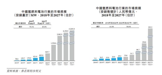而中國氫燃料電池行業的市場規模也已由2018年的人民幣7億元增至2022年的29億元,復合年增長率為41.8%。預計將于2027年達到人民幣293億元。