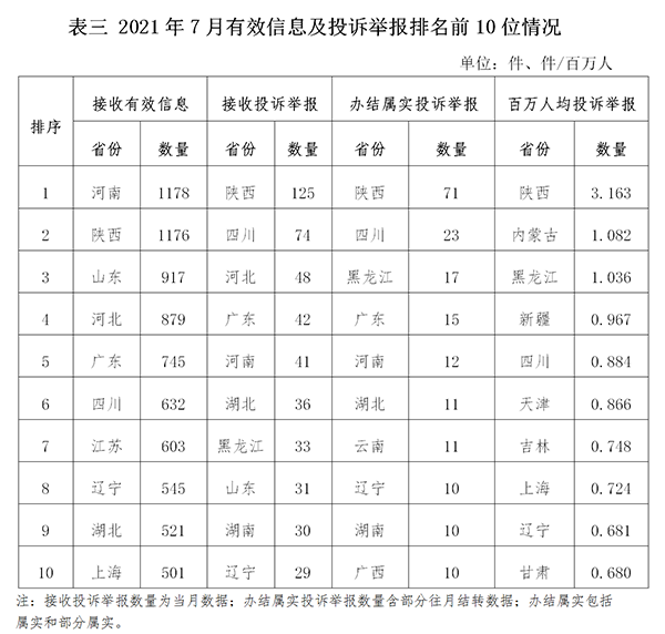 各省(自治區、直轄市)按照接收的有效信息數量排序,河南、陜西、山東、河北、廣東、四川、江蘇、遼寧、湖北、上海列全國前10位;按照接收的投訴舉報數量排序,陜西、四川、河北、廣東、河南、湖北、黑龍江、山東、湖南、遼寧排在全國前10位;按照辦結屬實的投訴舉報數量排序,陜西、四川、黑龍江、廣東、河南、湖北、云南、遼寧、湖南、廣西排在全國前10位;按照百萬人均投訴舉報數量排序,陜西、內蒙古、黑龍江、新疆、四川、天津、吉林、上海、遼寧、甘肅排在全國前10位。(2021年7月有效信息及投訴舉報排名前10位情況見表三)