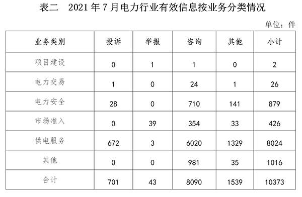 2021年7月,國家能源局12398能源監管熱線(以下簡稱12398熱線)共收到有效信息12822件(包含投訴、舉報、咨詢和其他訴求類別),環比增加29.52%,同比增加11.58%。(2021年7月收到有效信息情況見表一)