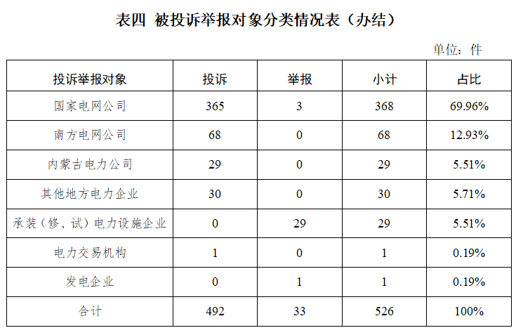 從被投訴舉報對象看,供電企業495件、占投訴舉報總數的94.10%,其中國家電網公司368件,占比69.96%;南方電網公司68件,占比12.93%;內蒙古電力公司29件,占比5.51%;其他地方電力企業30件,占比5.71%;承裝(修、試)電力設施企業29件,占比5.51%;發電企業1件,占比0.19%;電力交易機構1件,占比0.19%。