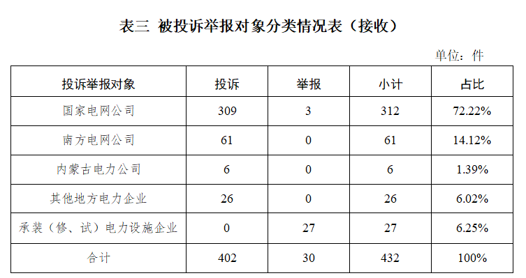 供電企業402件、占投訴舉報總數的93.75%,其中國家電網公司312件、占投訴舉報總數的72.22%,南方電網公司61件、占投訴舉報總數的14.12%,內蒙古電力公司6件、占投訴舉報總數的1.39%,其他地方電力企業26件、占投訴舉報總數的6.02%;承裝(修、試)電力設施企業27件、占投訴舉報總數的6.25%。