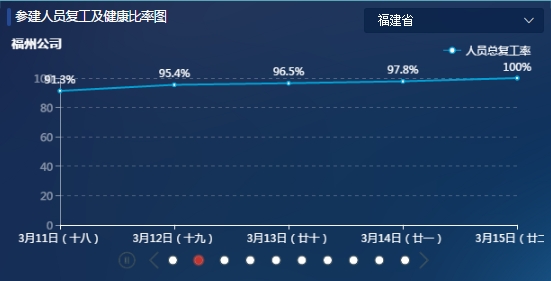 據了解,目前該應用已上線了綜合展示、統計分析、項目管理、報表查詢4個重點功能。一是綜合展示,分別以地圖、熱圖、柱狀圖、曲線圖等不同方式,可直觀對比展示福建省各地區項目開復工生態指數及恢復趨勢等8個指標;二是統計分析,可展示出不同維度下各地區、各部人員復工率的恢復程度以及健康情況的統計視圖;三是項目管理,可查詢到全省各地市的具體項目復工復產情況,進而實現對每個項目部的精準分析;四是報表查詢,內含項目詳細信息、人員詳細信息、人員健康情況等詳細信息,便于及時掌握人員、項目動態。