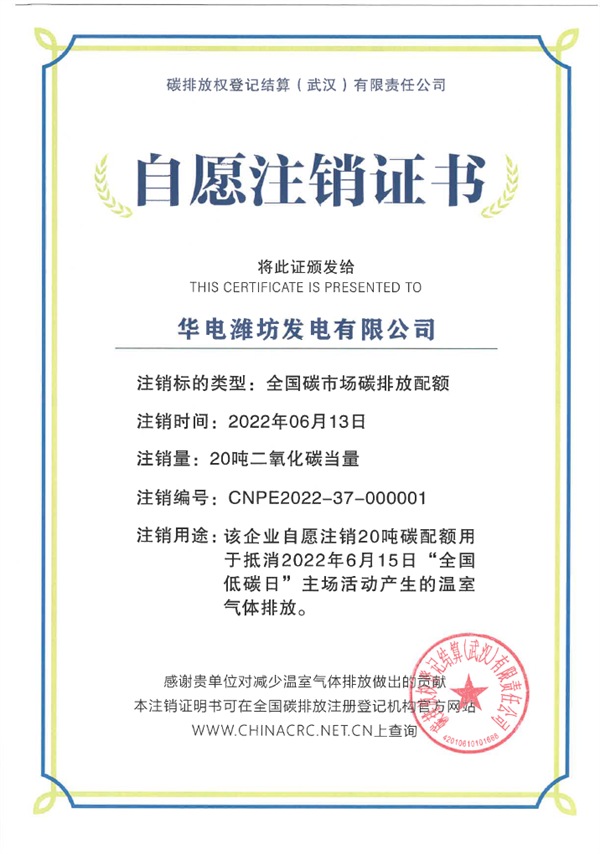 近年來,中國華電深入貫徹落實習近平生態文明思想,弘揚綠色低碳理念,增強節能降碳意識,推動高質量發展,助力“雙碳”目標實現。6月15日,由生態環境部、山東省人民政府共同主辦的2022年“全國低碳日”主場活動將在濟南舉行,活動主題為“落實‘雙碳’行動 共建美麗家園”。華電濰坊公司自愿為本次活動捐贈全國碳配額20噸,碳排放登記結算(武漢)有限責任公司為其頒發了“全國碳市場碳排放配額自愿注銷證書”。