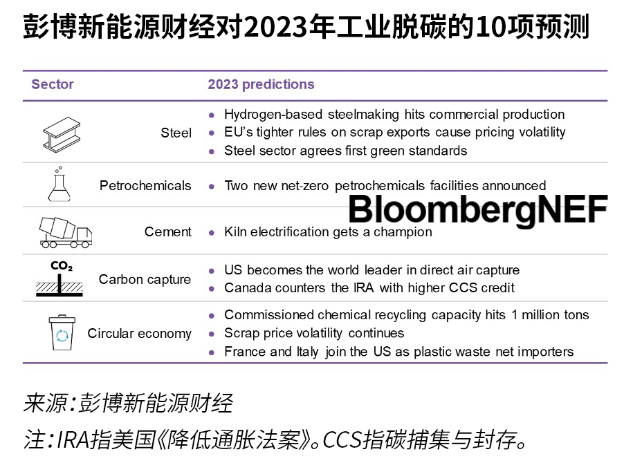 長期以來被認為難以減排的工業部門正在以比預期更快的速度脫碳。歐洲已經開始綠鋼試點生產,水泥廠正在宣布全面的碳捕集裝置,加拿大和法國正在建造凈零石化綜合設施。2023年還會有更多此類行動。