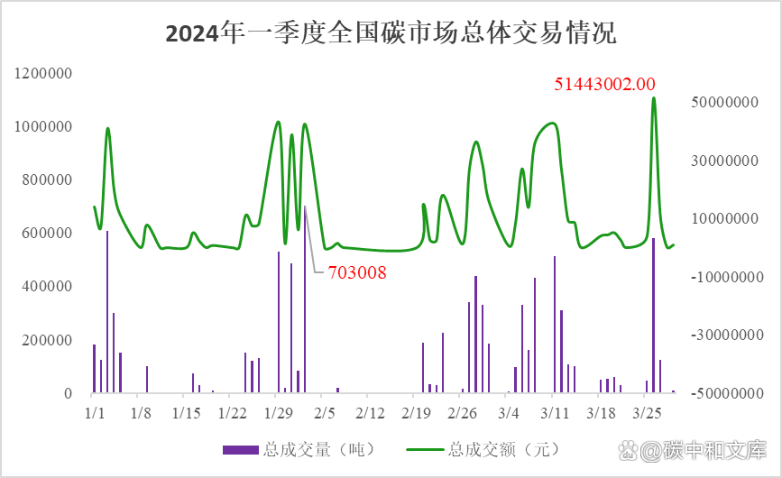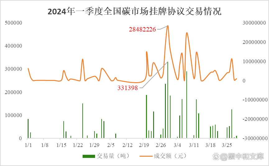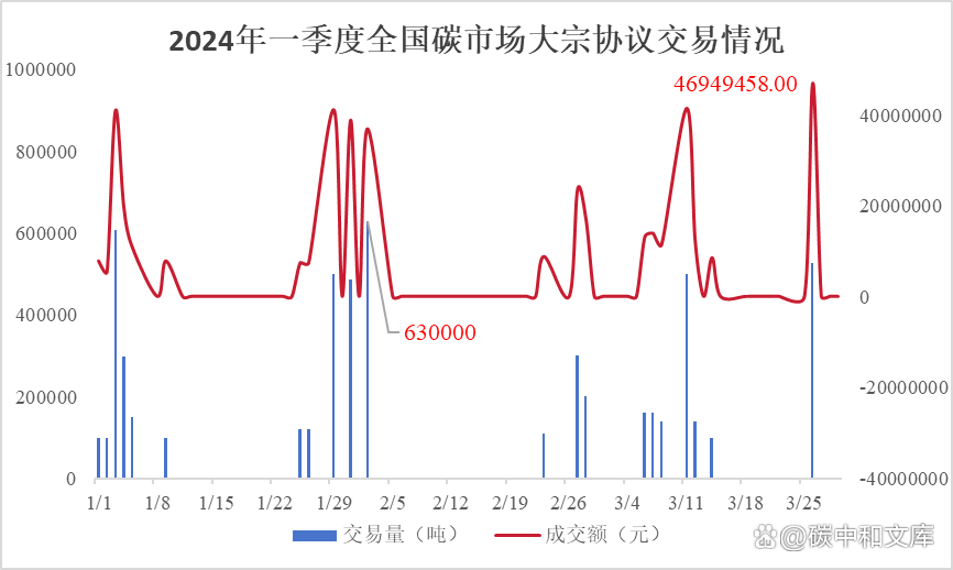具體交易情況如下圖所示:2024年一季度碳市場掛牌協議交易碳配額總計3067072噸,交易金額達到了252341511.54元,交易均價為82.27元/噸。其中2024年2月29日交易量和交易金額最多,分別為331398噸和28482226元。大宗協議交易碳配額總計5548187噸,交易金額達到了420928187.9元,交易均價為75.87元/噸。其中2024年2月2日交易量最多達到了630000噸,2024年3月8日交易金額最大為46949458元。