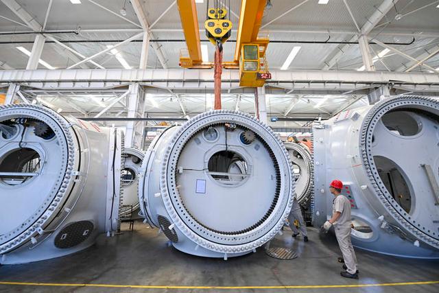 工人在位于山西轉型綜合改革示范區的太重集團新能源產業園區吊運風電裝備(2024年5月30日攝)。新華社記者 楊晨光 攝