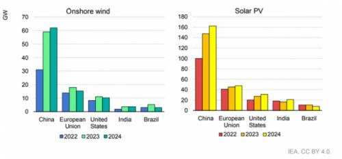光伏組件價格的下降、分布式光伏系統的更多采用以及大規模部署的政策推動,推動了包括中國、歐盟、美國和印度在內的所有主要光伏市場的增長。相比之下,如果不迅速實施激勵政策,預計2024年全球陸上風力發電新增裝機容量將比2023年下降約5%。