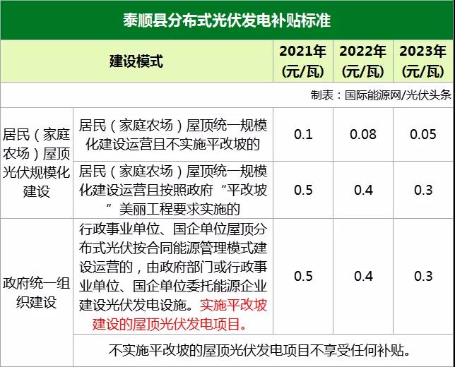 居民(家庭農場)屋頂統一規模化建設運營且按照政府“平改坡”美麗工程要求實施的,在光伏發電項目建成、并網和驗收后給予居民發放一次性平改坡建設補貼。2021年、2022年、2023年建成、并網和驗收的實行差異化補貼,補貼標準分別為0.5元/瓦、0.4元/瓦、0.3元/瓦。