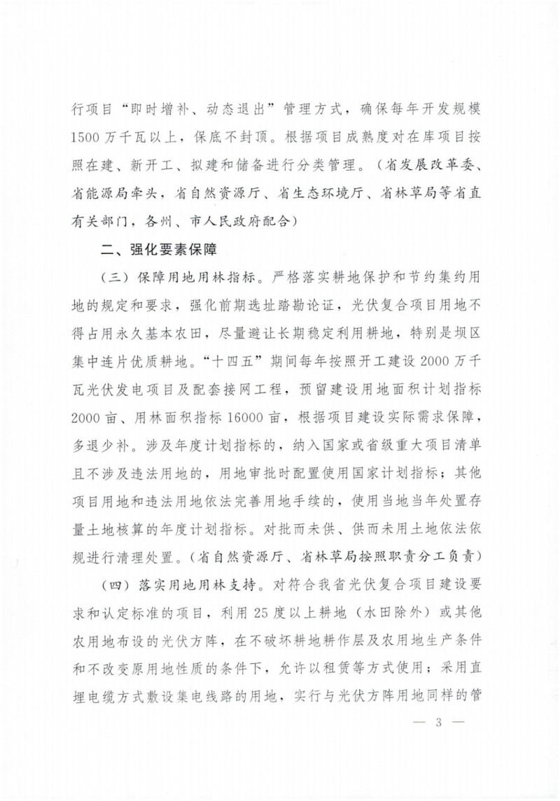 “十四五”期間按照每年開工20GW光伏項目及配套接網工程預留建設用地面積2000畝、用林面積1600畝,根據實際需求多退少補。對于涉及國家或省級重大項目的,用地審批配置國家計劃指標。對于符合光伏復合項目建設要求和認定標準的,利用25度以上耕地或其他農用地的,在不破壞耕地、不改變原用地性質的項目允許以租賃方式使用。
