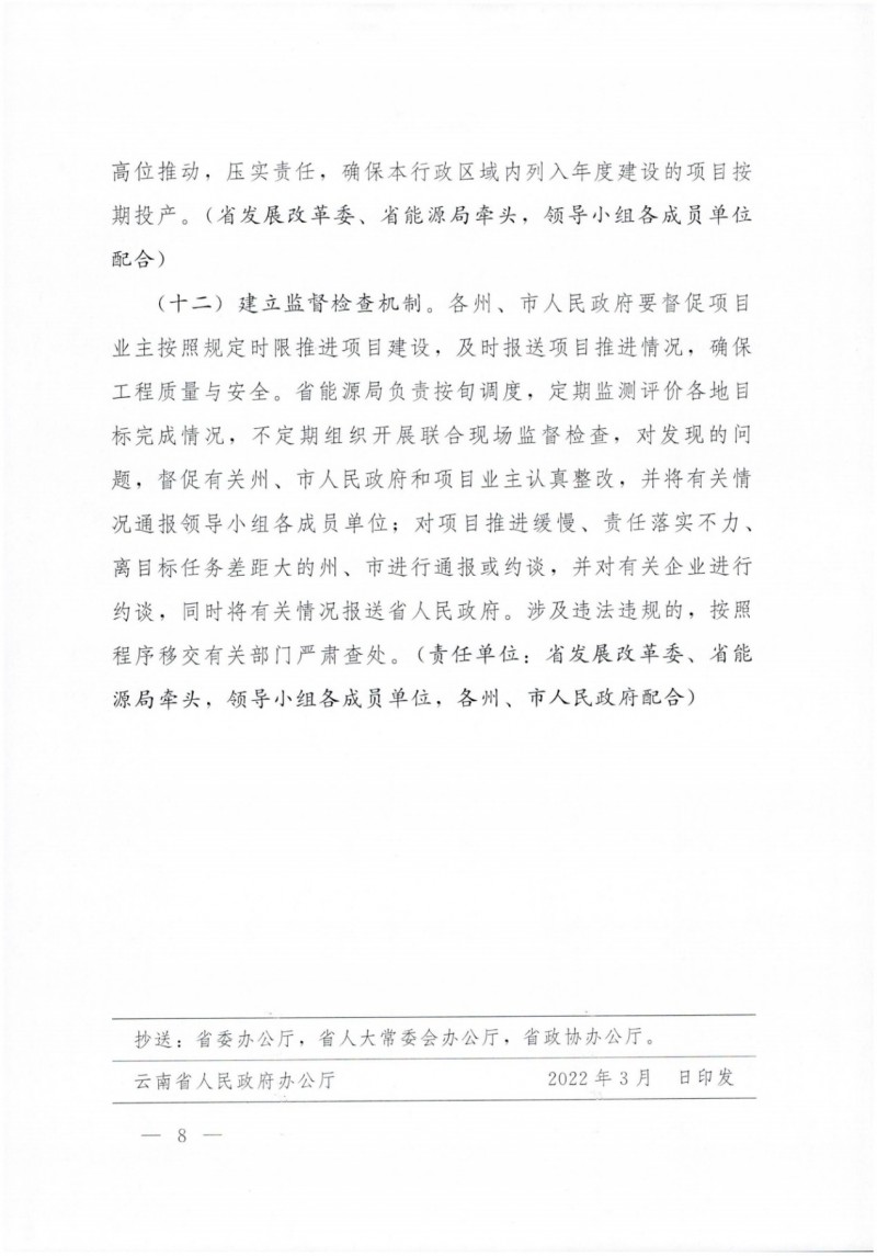 優先支持大型基地開發,重點支持金沙江下游、瀾滄江中下游、紅河流域、金沙江中游、瀾滄江金沙江上游“風光水儲”和曲靖“風光火儲”等6個多能互補基地,爭取3年內全面開工并基本建成。支持“新能源+鄉村振興”項目,積極開展“千鄉萬村沐光行動,重點支持新能源+特色產業、生態修復、綠色食品、鄉村旅游等項目。