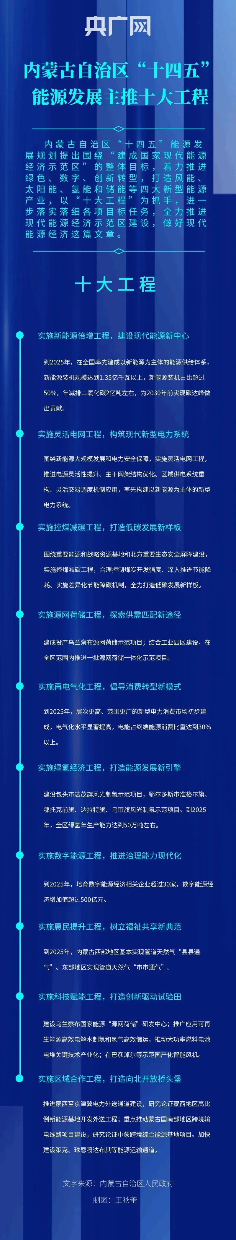 “十四五”時期,內蒙古將以建設國家現代能源經濟示范區為總體目標,推進能源和戰略資源基地優化升級。具體工作中,將依托能源基地建設,以資源和市場換產業,開展新型能源產業關鍵裝備及其零部件制造,打造風能、太陽能、氫能、儲能四大新型能源產業,以“十大工程”為抓手,進一步落實落細各項目標任務,全力推進現代能源經濟示范區建設,做好現代能源經濟這篇文章。