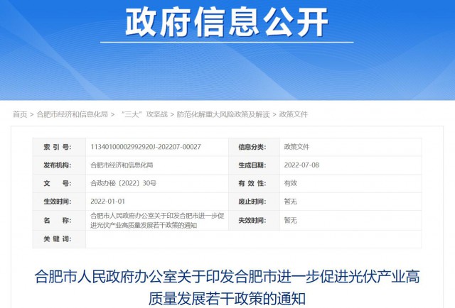 10月18日,合肥市經(jīng)濟和信息化局、合肥市財政局聯(lián)合發(fā)布“關(guān)于印發(fā)《合肥市進一步促進光伏產(chǎn)業(yè)高質(zhì)量發(fā)展若干政策實施細則》的通知”。