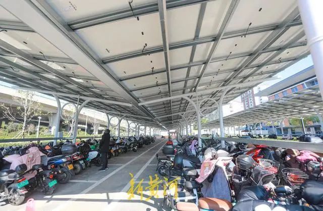 山東大學(xué)國(guó)家大學(xué)科技園停車場(chǎng)的車棚采用光伏一體化結(jié)構(gòu),光伏面板架設(shè)于停車位上方的鋼桁架上,以光伏電池板代替車棚頂面,既能避免車輛日曬雨淋,所發(fā)出的電力又能為園區(qū)、車棚提供照明,起到一舉多得的效果。車棚內(nèi)安裝了充電樁、儲(chǔ)能等配套設(shè)施,可以為電動(dòng)汽車、電動(dòng)自行車充電,實(shí)現(xiàn)了光儲(chǔ)充一體化,綠色低碳場(chǎng)景再添新貌,進(jìn)一步邁向智慧零碳園區(qū)。
