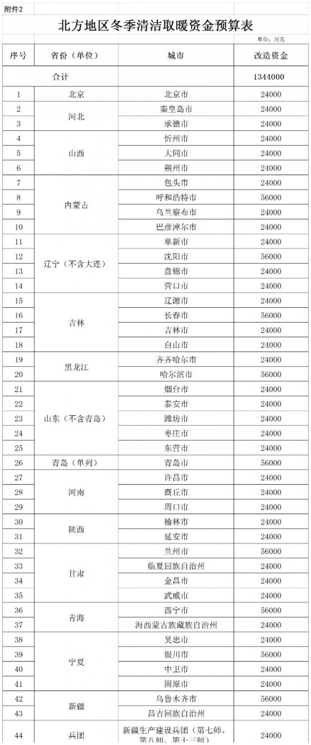 二、北方地區冬季清潔取暖資金額度詳見附件2、3。請相關省抓緊撥付資金,會同有關部門督促相關城市積極穩妥地做好清潔取暖工作。