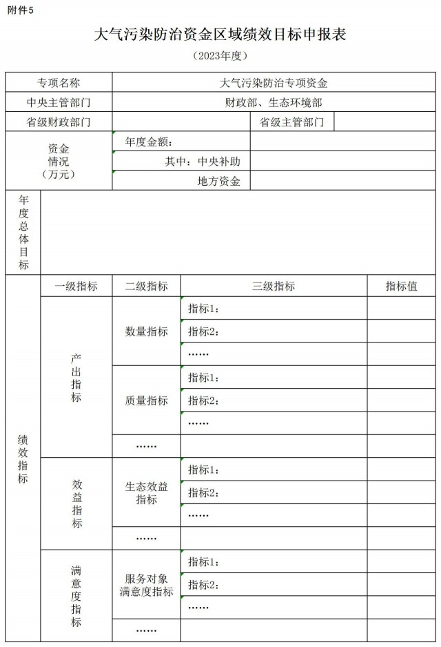 五、為進一步加強預算績效管理,請按照《中共中央 國務院關于全面實施預算績效管理的意見》的要求,完善績效目標管理,科學填報《大氣污染防治資金區域績效目標申報表》(附件5),并在收到本通知之日起30日內報我部和生態環境部審核和下達,做好績效監控和績效評價,確保財政資金安全有效。請參照中央財政做法,將你省確定后的績效目標及時對下分解,做好預算績效管理工作。《大氣污染防治資金區域績效目標申報表》和分解下達績效目標要同時抄送財政部有關監管局。
