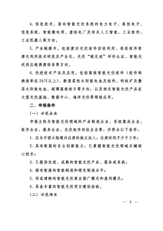 6.先進技術產品及應用。包括高效智能光伏組件(組件轉換效率在24%以上)、新型柔性太陽能電池及組件、鈣鈦礦及疊層太陽能電池、超薄高效硅片等方向,以及相關智能光伏產品在大型光伏基地、數據中心、海洋光伏等領域應用。