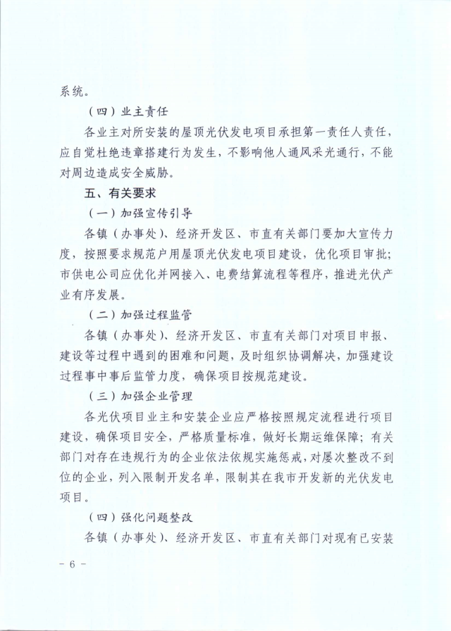根據文件,《通知》主要規范個有獨立產權的戶用屋頂光伏發電項目。全市所有學校、醫院、政府投資標準廠房、辦公樓等國有和集體權屬房屋,未經批準不得擅自實施屋頂光伏發電項目。