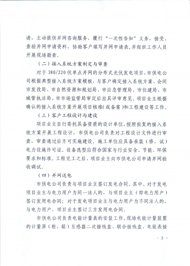 并網方面,則是對于380/220伏單點并網的分布式光伏發電項目,市供電公司根據典型接入系統方案模板,與客戶確定接入系統方案,會同市發改局、市自然資源和規劃局、市應急管理局、市住建局、市城管執法局、市市場監管局審定后出具評審意見。項目業主根據確認的接入系統方案開展項目核準(或備案)和工程建設等工作。
