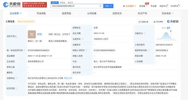 天眼查App顯示,11月20日,黑龍江省新能源集團有限公司成立,法定代表人為劉軼,注冊資本10億人民幣,經營范圍含新興能源技術研發、風電場相關系統研發、以自有資金從事投資活動、風力發電技術服務、太陽能發電技術服務、儲能技術服務、工程管理服務等。股東信息顯示,該公司由中國一重(601106)、佳電股份(000922)、黑龍江辰能清潔能源有限公司、上海電氣新能源發展有限公司、北京天潤新能投資有限公司共同持股。