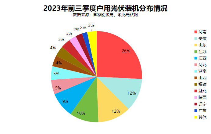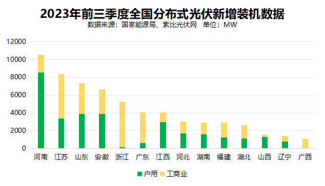 光伏發電方面,2023年前三季度,光伏新增裝機12894萬千瓦(128.94GW),同比增長145%,其中集中式光伏6180萬千瓦(61.8GW),分布式光伏6714萬千瓦(67.14GW),分布式光伏占比超過52%。分地區看,河南、山東、江蘇、湖北等11個省(自治區),前三季度光伏發電新增裝機超過5GW,其中7省的分布式光伏占比都超過一半。最高的河南省,分布式光伏占比超過98.6%,成為名副其實的“分布式光伏發展熱土”。