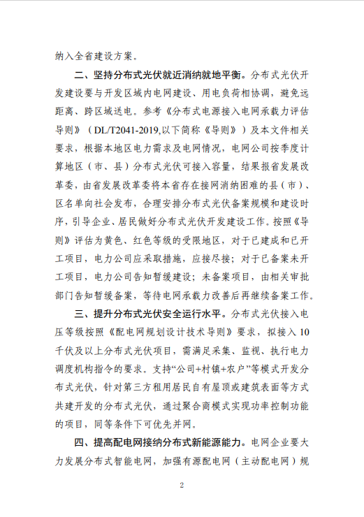 文件提出,加強地方指導及監督工作。各市能源主管部門應統籌推進分布式光伏開發建設工作,結合發布的評估結果,在規劃制定、項目開發等環節積極引導分布式光伏合理布局、有序建設,促進源網協調發展。同時在建設開發分布式光伏項目過程中要嚴格備案管理,嚴厲打擊“光伏貸”、過度宣傳、承諾保障項目收益等侵害人民群眾合法權益行為,推動當地分布式光伏健康有序發展。