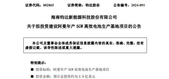 7月25日晚間,鈞達股份公告稱,公司擬于阿曼蘇丹國(下稱“阿曼”)投資建設5GW高效電池生產基地,該項目預計投資總額2.8億美元,項目建設周期約9個月,預計2025年建成投產。