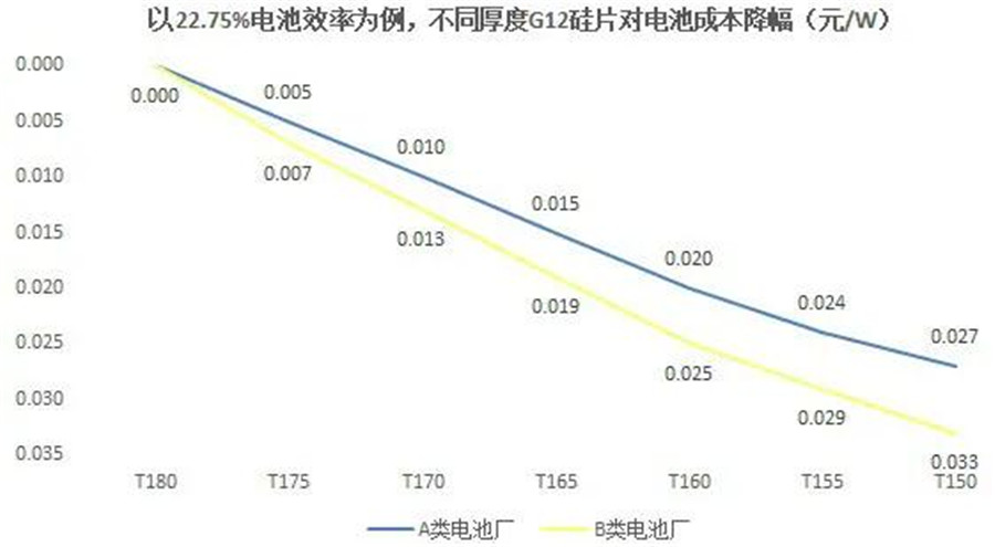 在成本核算上,依據上述效率測算條件,應用160μm硅片的電池,每片成本降幅為0.025元/W。