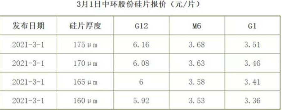 參考中環股份2月份報價,M6(175μm)售價為3.35元/片,那么3月份M6(160μm)報價漲價0.18元/片,漲幅為5.3%。