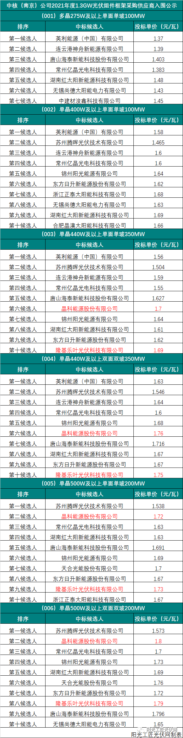 2)中核(南京)1.3GW第一候選人報價在1.37~1.63元/W之間入圍公示詳細情況參考附件