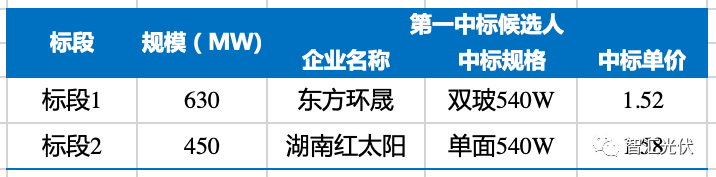 根據索比光伏網統計,廣州發展集采標段一中標候選人第一名為環晟光伏,投標單價1.52元/W,且為最低投標單價,組件投標規格為雙玻540W;標段二中標候選人第一名為湖南紅太陽,投標單價1.58元/W,組件投標規格為單面540W。詳情請見下表: