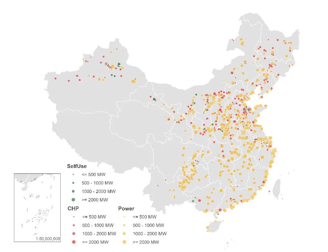 圖1 中國現役燃煤電廠的分布,應用領域及裝機容量