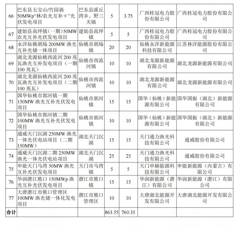 3)77個平價光伏項目,總規模863.55萬千瓦 ,擬配置規模760.35萬千瓦;