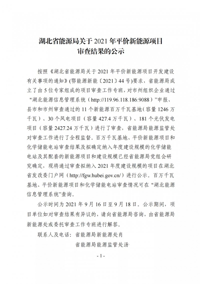 9月15日,湖北省能源局下發《關于2021年平價新能源項目審查結果的公示》,提出: