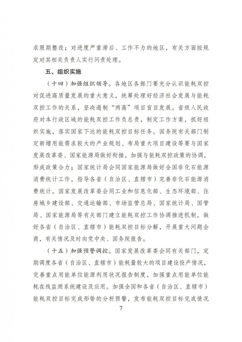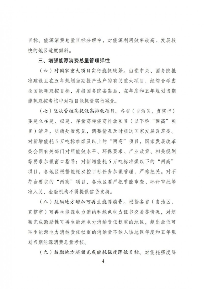 對新增能耗5萬噸標準煤及以上的“兩高”項目,國家發(fā)展改革委會同有關(guān)部門對照能效水平、環(huán)保要求、產(chǎn)業(yè)政策、相關(guān)規(guī)劃等要求加強窗口指導;對新增能耗5萬噸標準煤以下的“兩高”項目,各地區(qū)根據(jù)能耗雙控目標任務(wù)加強管理,嚴格把關(guān)。對不符合要求的“兩高”項目,各地區(qū)要嚴把節(jié)能審查、環(huán)評審批等準入關(guān),金融機構(gòu)不得提供信貸支持。