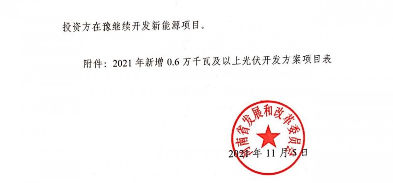 11月5日,河南省發改委下發《關于下達 2021年新增0.6萬千瓦及以上光伏項目開發方案的通知》。文件指出,對于不新增用地、利用固定建筑物及其附屬場所建設的光伏項目,不限申報規模!