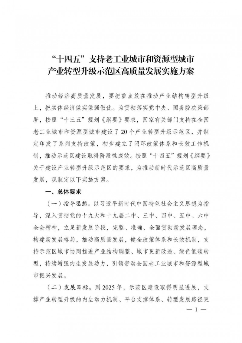近日,國家發改委、科技部、工信部、自然資源部、國家開發銀行聯合印發《“十四五”支持老工業城市和資源型城市產業轉型升級示范區高質量發展實施方案》。