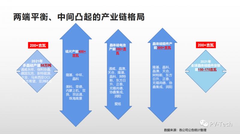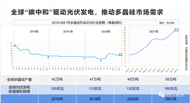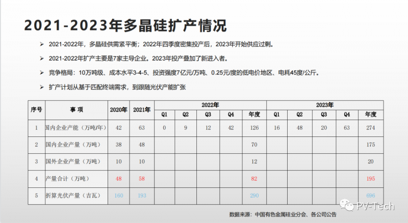 呂錦標在報告里也公布了全球7家主要企業和4家新進入企業的擴產情況,預測2022年多晶硅供應可以超過80萬噸,比今年增加20萬噸。主要產能集中在下半年投產。對應明年200吉瓦的裝機預測,多晶硅供應大于需求。有望推動價格下行。