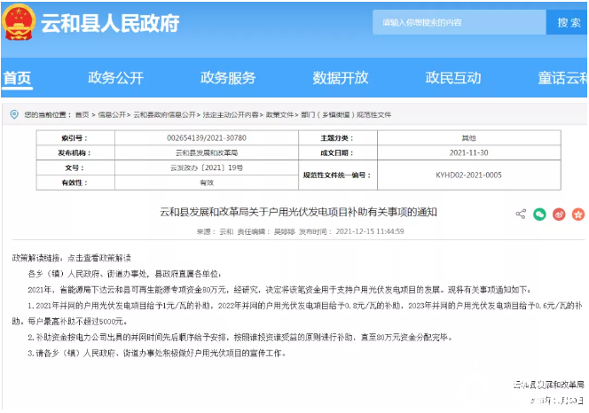 《通知》指出,2021年,省能源局下達云和縣可再生能源專項資金80萬元,經研究,決定將該筆資金用于支持戶用光伏發電項目的發展。