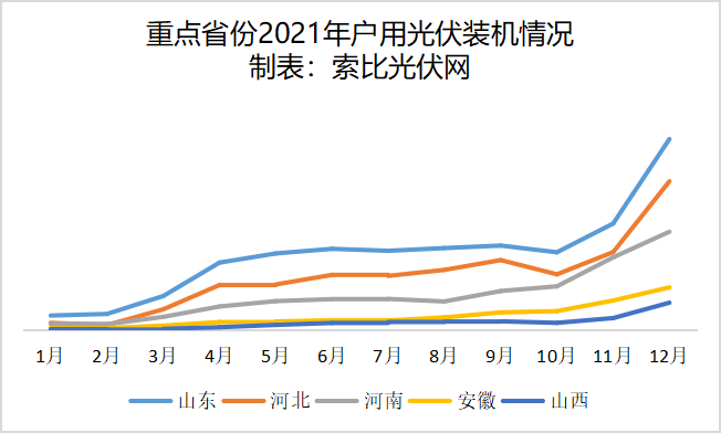 從2021年各省戶用光伏裝機規模看,山東、河北、河南依然是最核心的三個主力市場,安徽、山西、江西、福建、江蘇等5個省也實現了裝機超400MW、占比超2%的目標。